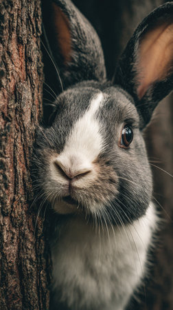 A close-up captures a rabbit's face with gray and white fur. The animal peeks from behind a rough tree trunk, its dark eye focused. The natural light emphasizes the texture of the fur and bark, creating a contrast. Suitable for editorial illustrations, animal-themed projects, and various creative uses.