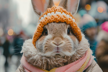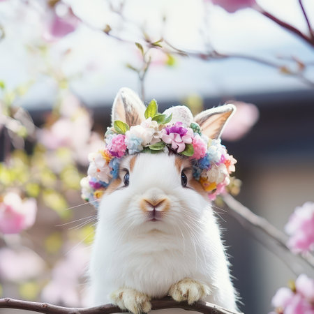 A cute rabbit poses with a colorful floral crown against a backdrop of blooming flowers in a tranquil spring garden setting.