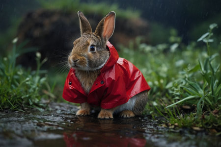 Rabbit wearing raincoat and raincoat in the rain. Animal concept.