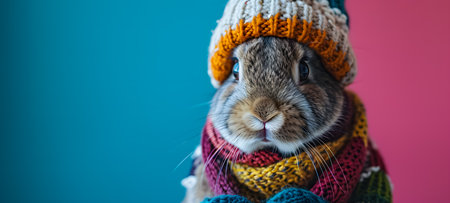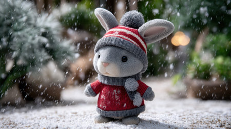 This adorable winter rabbit toy, dressed in a cozy red sweater and hat, stands in a snowy winter wonderland, creating a cheerful holiday atmosphere.