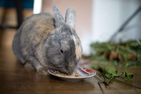 Funny cute rabbit eats grain, chews hay, pet sits, eats.