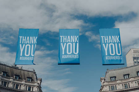 Low angle view of Thank You banners on Oxford Street, London, UK, against the blue sky and clouds.
