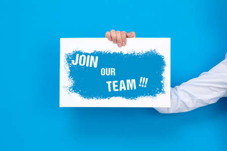mature bearded guy has long hair hold paper placate, copy space, promotion