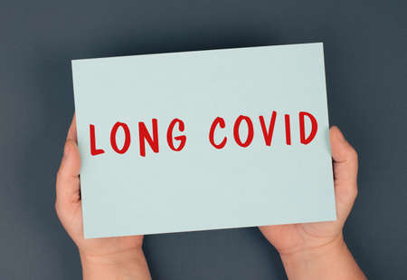 The words long covid are standing on a paper, hands hold the message, problems after covid-19 disease