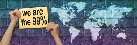 We are the 99% message banner - female hands holding a placard saying WE ARE THE 99% against a brick wall background with the world map imprinted on it with space for copy