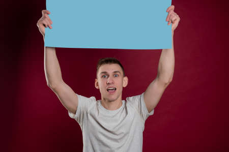 Surprised man with empty advertising banner. Man holds board for advertising. Handsome man with sign board. Space for text. Advertising. Black friday.