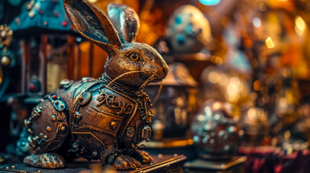 Easter, Steampunk-style mechanical rabbit with intricate metal details and gears.