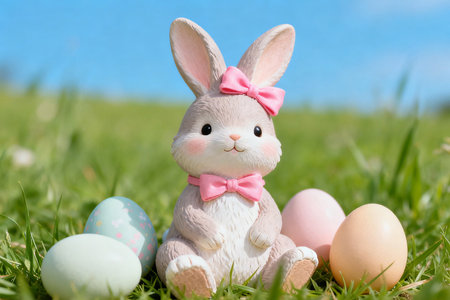 A decorative spring setting features a small white bunny sitting next to colorful eggs on green grass. A tree branch with blossoms and a tiny house add to the festive atmosphere.