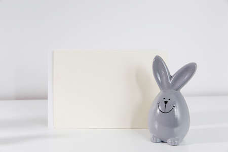 Mock up white frame with modern ceramic easter bunny decor on a shelf. White color scheme. landscape frame orientation.