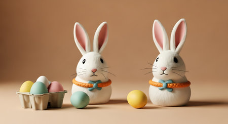 Two adorable white Easter bunnies with colorful eggs on a beige background
