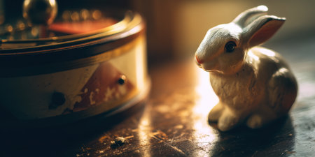 Cute ceramic bunny figurine beside vintage music box wooden table, warm soft light and nostalgic