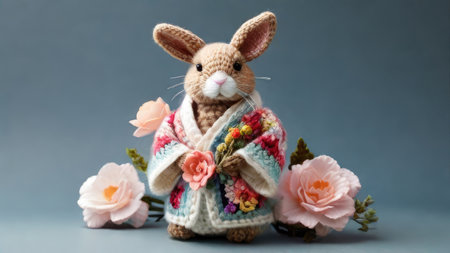 a fluffy toy hare knitted with threads stands in a kimono against a background of flowers. Asian holiday card for Easter. Handmade. children's illustration with pastel colors. Cute rabbit.