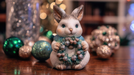 Adorable rabbit figurine holds a wreath, surrounded by shiny ornaments. Perfect for holiday decor, evoking joy and warmth in festive celebrations.