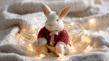 A cute bunny figurine dressed in a cozy red sweater sits surrounded by warm fairy lights on a soft blanket, creating a charming and festive atmosphere.