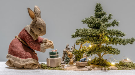 A charming rabbit figurine dressed for the holidays places gifts near a delightful miniature tree, creating a warm and festive atmosphere perfect for seasonal decor.