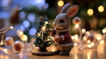 Adorable rabbit figurine in festive attire decorates a miniature Christmas tree surrounded by twinkling lights, evoking a warm holiday spirit.