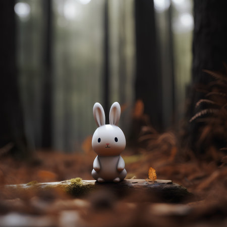 An enchanting scene featuring a knitted bunny toy in a cozy sweater, illuminated by soft lights amidst autumn leaves, creating a serene atmosphere.