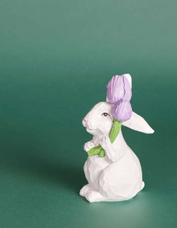 Ceramic Easter bunny on yellow background. Minimal easter concept.