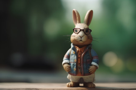 Easter bunny with glasses and blue shirt on the wooden table.