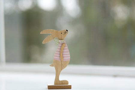 Handmade Easter Bunny. Blurred background. Easter toys. Wooden Easter eggs on white background, copy space.