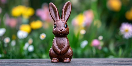 Chocolate Bunny on a Table Festive Easter Decor and Blurred Spring Flowers in Background