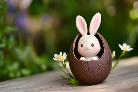 A tiny Easter Bunny hiding inside a giant chocolate egg, its ears sticking out playfully as it peeks from the delicious treat.