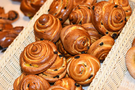 Beautiful delicious rolls, croissants, cakes and bread in the basket