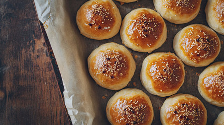 A tempting tray of freshly baked savory buns, golden brown and topped with sesame seeds, perfect for snacks, breakfast, or sharing at gatherings.