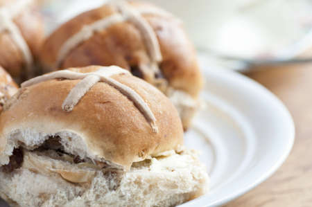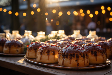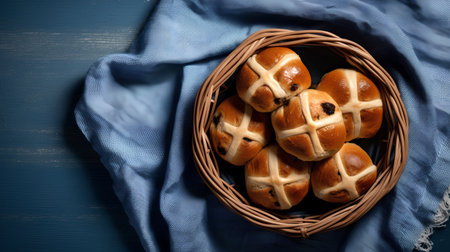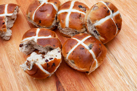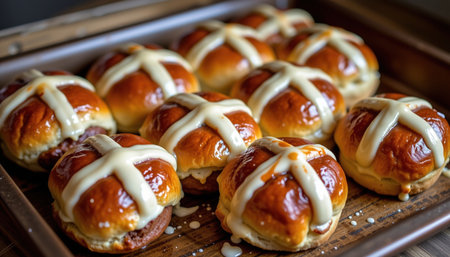 A freshly baked hot cross buns with glossy glaze, arranged neatly on tray, evoke sense of warmth and comfort