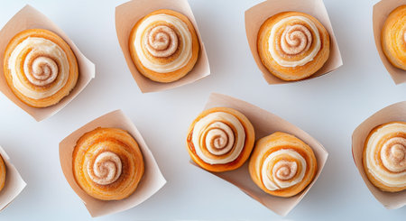 Pattern of freshly baked buns with frosting arranged on light surface, sweet bakery concept