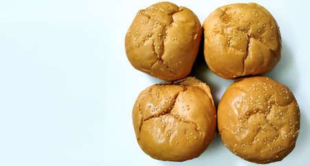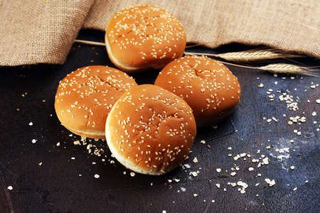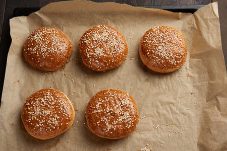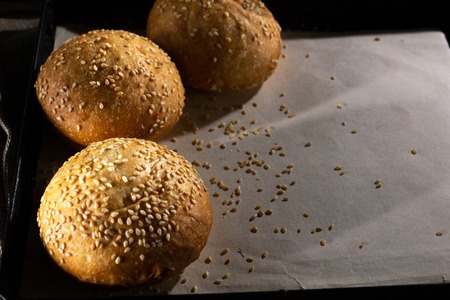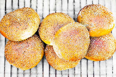 Sesame Seed Hamburger Buns baked in a home oven. Ingredient for sandwiches.