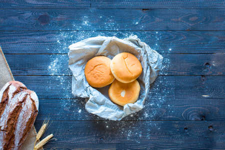 Whole grain bread rolls in a basket for Breakfast or Burgers. Food background with copy space, top view.