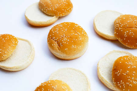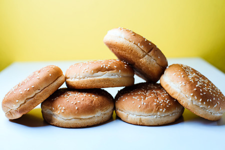 Closeup of tasty burger buns with sesame on a white and yellow background