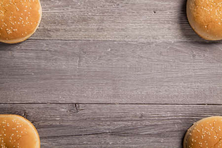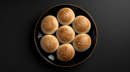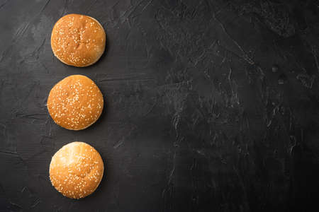Hamburger buns with sesame set, on black stone background, top view flat lay, with copy space for text