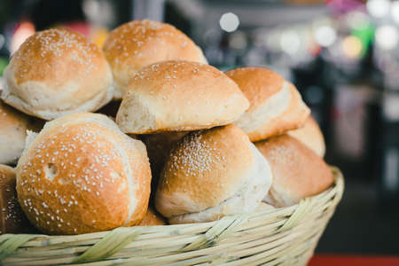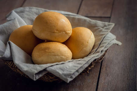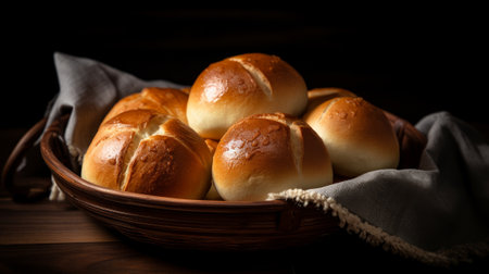 Warm freshly baked bread rolls in wicker basket by sunny window
