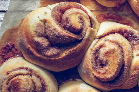 Top close-up view of homemade Swedish cardamom and cinnamon rolls. Landscape format.