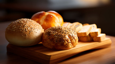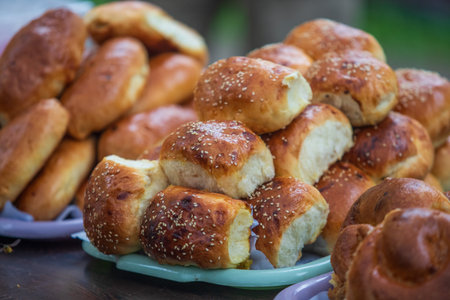 A stack of bread with sesame seeds on top. The bread is brown and looks delicious. Concept of warmth and comfort, as if someone is about to enjoy a meal with their loved ones