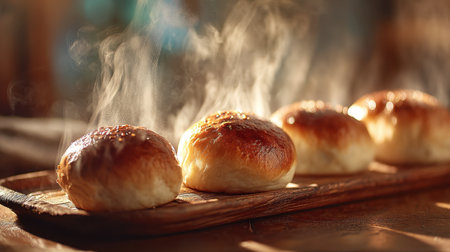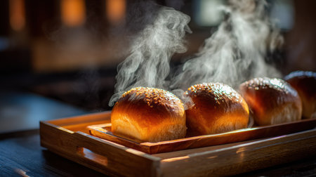 A captivating image of freshly baked bread rolls on a wooden tray, with steam rising to highlight their soft texture and golden crust. Perfect for food lovers.