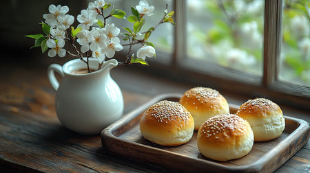 A wooden tray with buns and coffee on the table, next to it is an elegant white ceramic vase filled with blooming almond blossoms, in front of the window overlooking the spring nature outside. The scene exudes warmth and comfort, as if you were sitting at home enjoying your morning meal. --chaos 30 --ar 16:9 --stylize 750 --v 6.1 Job ID: 94723dad-fd0e-438e-9e41-36d6623937a2