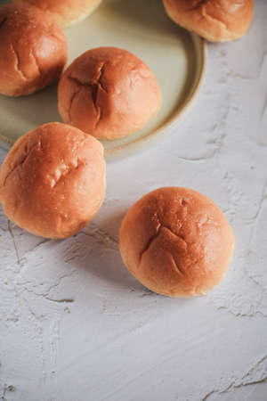 Minimalist display of perfectly baked round dinner rolls with golden brown tops and soft texture. Clean white background emphasizes freshness. Concept of baking, culinary arts, restaurants.