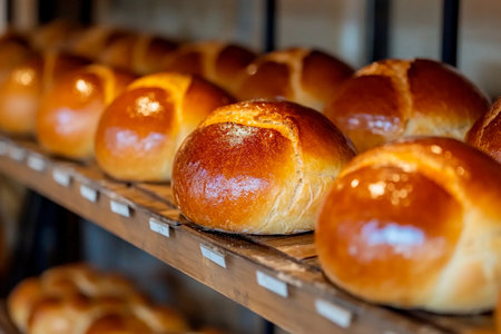 Aromas of warm bread fill the air as golden rolls sit enticingly on wooden shelves. The bakery glows softly with light, inviting all to indulge in its delightful offerings.