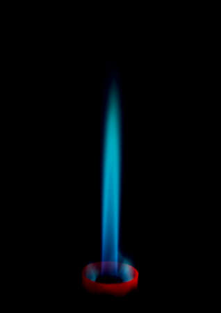 The flame of a gas tourist burner. Blue fire isolated on black background, closeup.