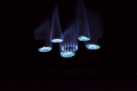 Gas stove burner with blue flames in the dark. Use of gas in home life.