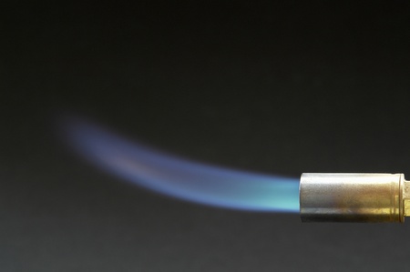 Gas cartridge gun lighter .Close-up nozzle of burner with blue flmae