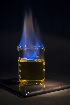 Flames in dark. Tongue of fire one. Alcohol flame retardation. Yellow glow on black background.