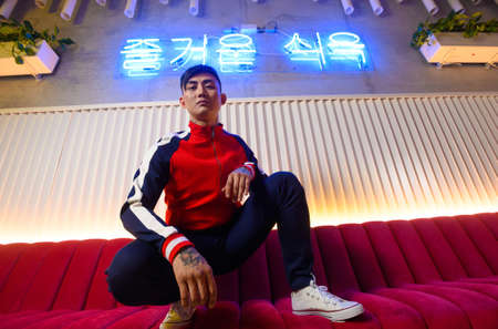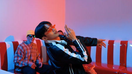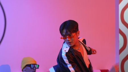 Asian man standing and dancing with pop music while multicultural friend sitting behind at home with led light. Attractive street dancer moving to hip hop music while looking at camera. Regalement.