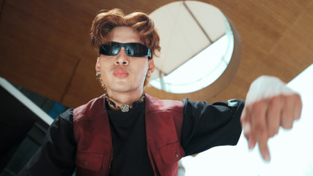 Modern dancer posing at camera with confident with low angle camera. Portrait of young hip hop dancer dancing while wearing in hip hop style. Outdoor sport 2024. Motion shot. Freestyle. Endeavor.