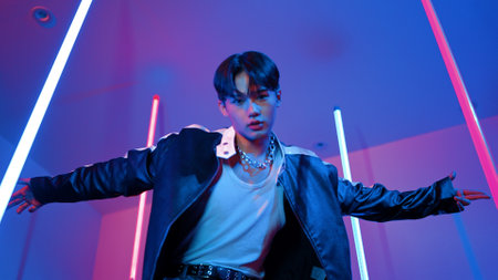 Low angle camera of professional street dancer looking at camera with casual cloth. Skilled performer moving to city pop music while standing at studio with purple led light. Close up. Regalement.