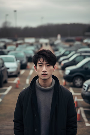 young handsome asian hipster man in black coat outdoor parking lot