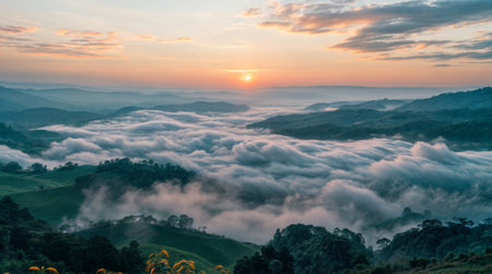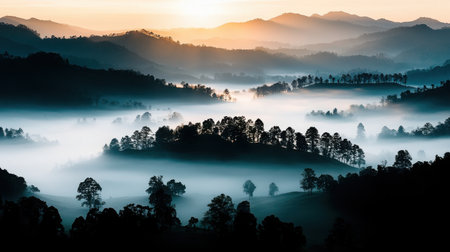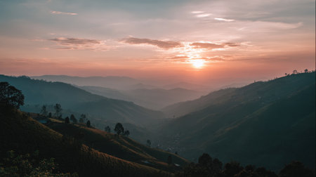Experience a stunning sunset illuminating rolling hills, where mist gently blankets valleys. The serene landscape captures nature's beauty during golden hour.